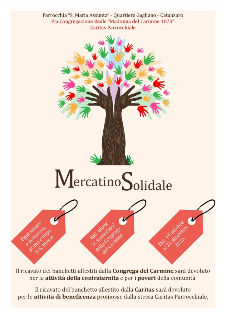 Dal  19 ottobre al 21 dicembre 2025, ogni sabato e domenica, prima e dopo le S. Messe, nel salone “F. Scorzafava” della Congrega del Carmine sarà allestito il mercatino solidale.