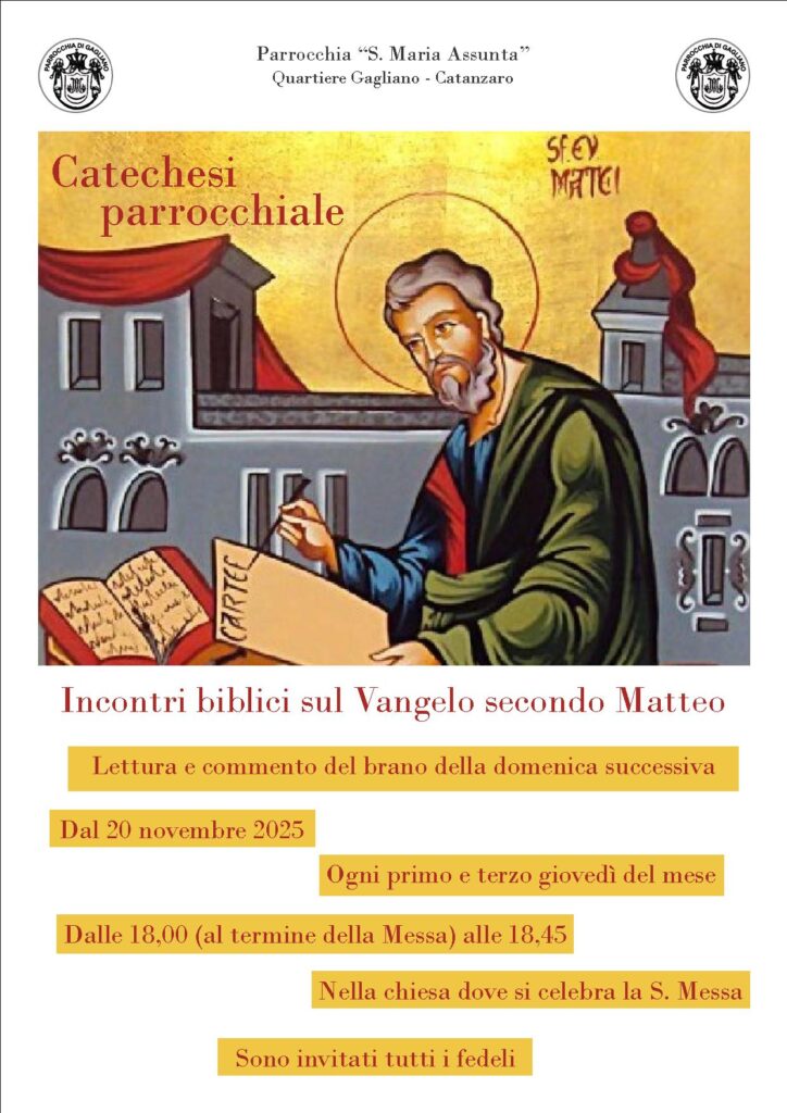CATECHESI PARROCCHIALE❤️❤️❤️❤️ Con gioia vi comunico che giovedì prossimo, 20 NOVEMBRE, riprenderemo gli incontri parrocchiali di CATECHESI.Si terranno a giovedì alterni (ogni PRIMO E TERZO GIOVEDÌ del mese), nella chiesa dove quel giorno si celebra la Messa, al termine della funzione (DALLE ORE 18,00 ALLE ORE 18,45).Insieme leggeremo e rifletteremo sul VANGELO DI MATTEO, seguendo la LITURGIA DELLA DOMENICA SUCCESSIVA. Gli incontri sono aperti a tutti!